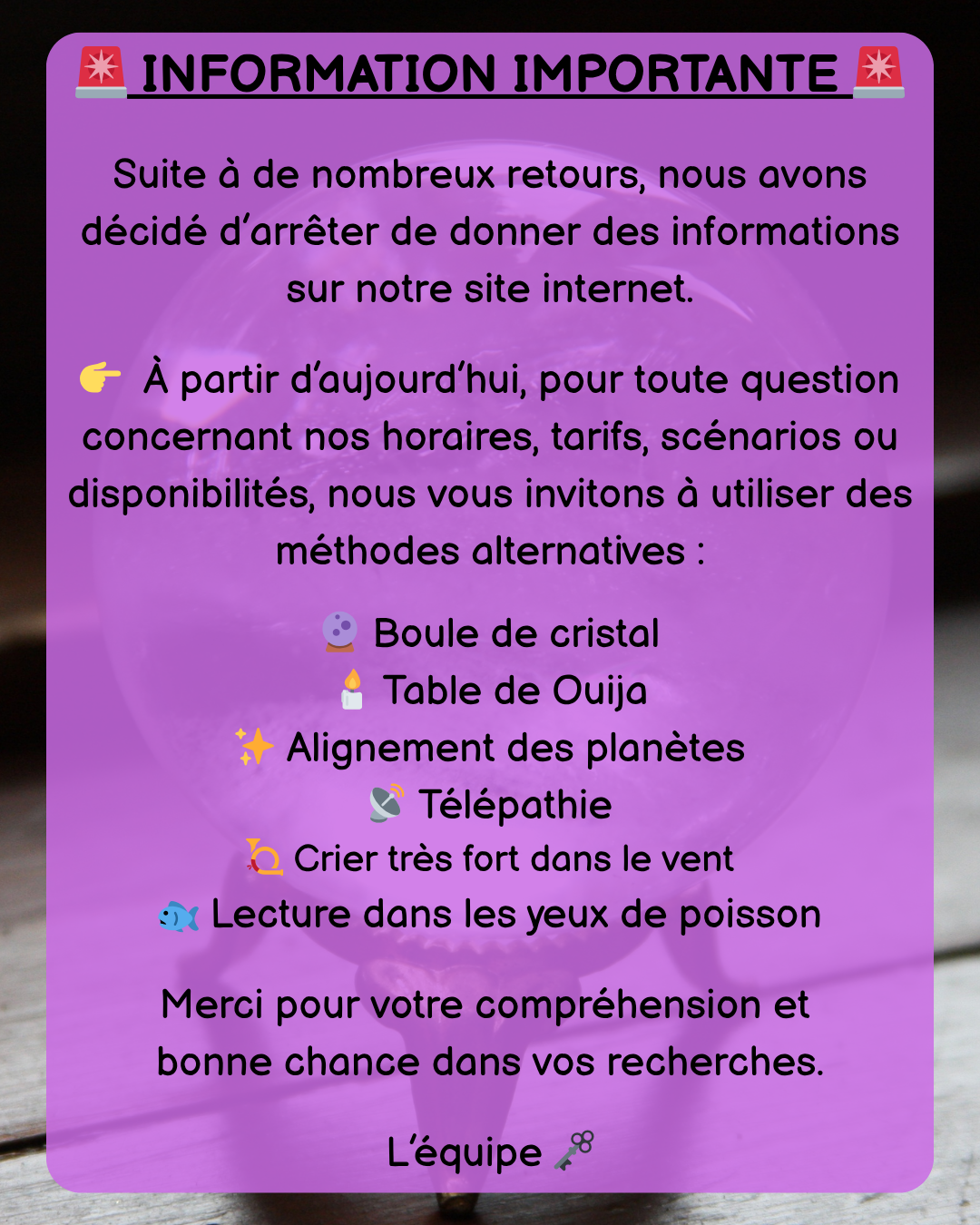 Tout retard entraînera une annulation de la session de jeu.